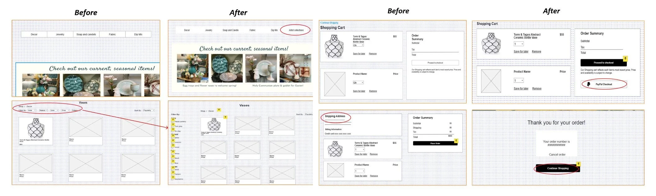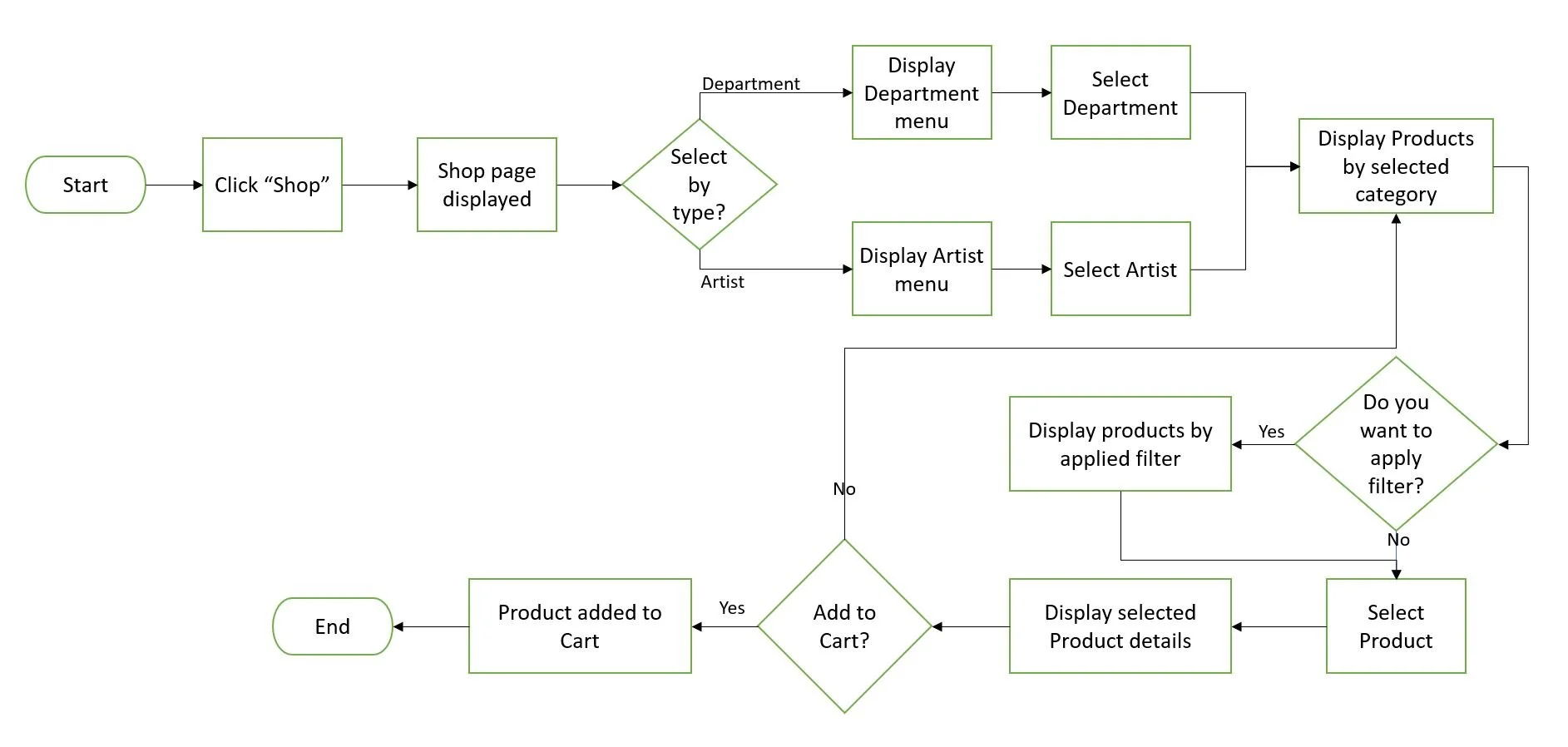 I created low fidelity wireframes in Axure and conducted usability testing. Made changes to the main navigation bar by providing an option to shop by artist . Also moved my filtering options towards left side of the page and provided an option to select multiple filters for each product and helping users get what they exactly wanted.