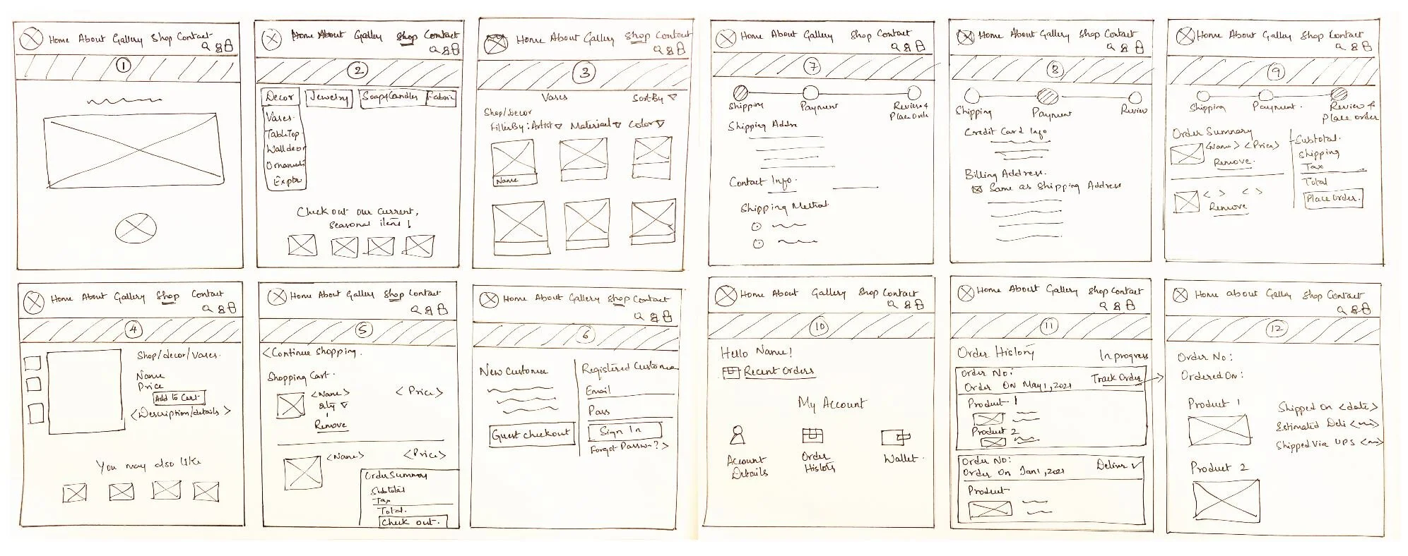 With the design goals in mind, I developed sketches to define the layout and navigation. My initial sketches did not have a main navigation bar to shop by artist collections . Later, included that during my design iterations.