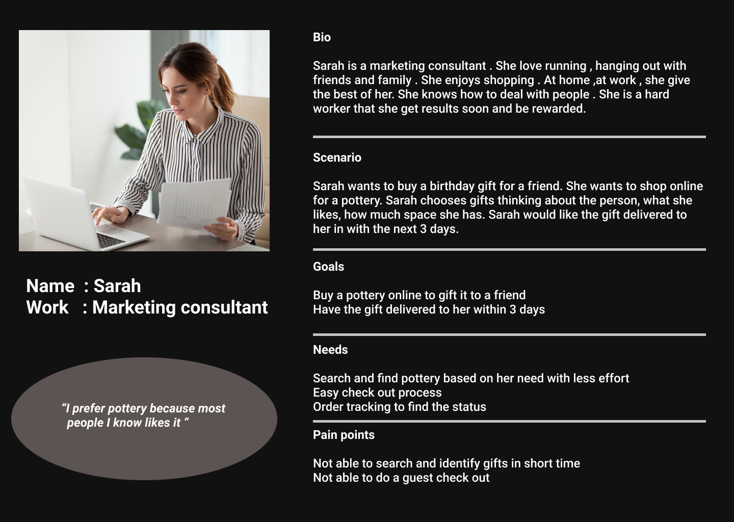 Based on the analysis, personas reflect two groups of users with distinct behaviors. Primary persona represents the user who buys pottery and art supplies for gifting purposes and secondary persona represents users who buys pottery for decorating their home.