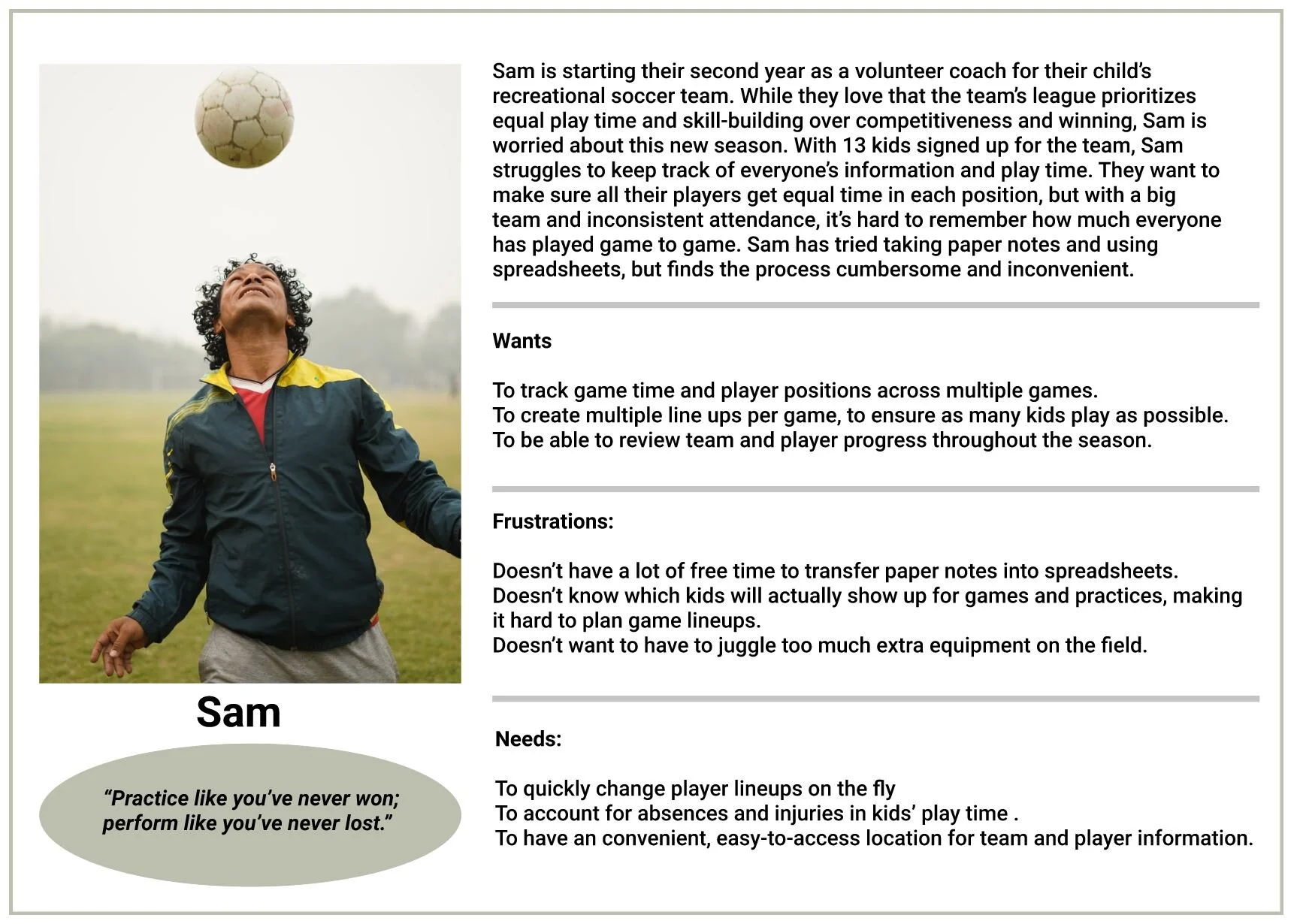 “As a coach, Sam needs an easy way to track positions and playtime for his youth recreational soccer team, so that the players have an equal opportunity to participate and build skills”..