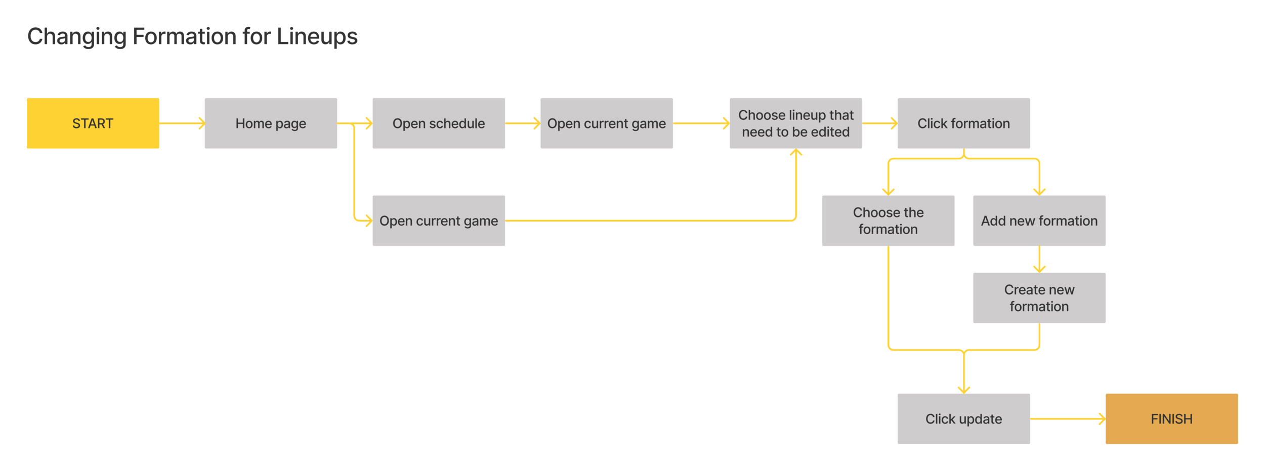 Our user flow shows how a new player is added to the team, rotating players depending on the position played and how to choose formation or add new formation.