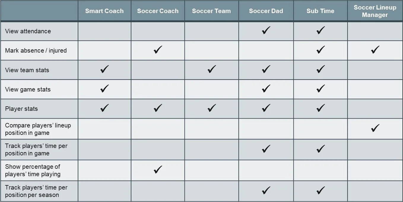 The apps selected for analysis were Smart coach, Soccer coach, Soccer team, Soccer dad and Sub time. All apps had features relevant to competitive soccer. Apps also captured detailed player statistics, extensive game logs (to log assists, passes) and coaching manuals etc...,